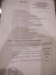 سنڌ ڪابي جي اڄوڪي اجلاس ۾ سنڌ انشورنس لميٽيڊ جو چيف آپريٽنگ آفيسر مقرر ڪرڻ جي منظوري ورتي ويندي، ڪابينا اقليتن واري کاتي جي ڊائريڪٽوريٽ آفيس کي حيدرآباد مان ڪراچي منتقل ڪرڻ، بختاور ڪيڊٽ ڪاليج جي بورڊ آف ڊائريڪٽرس جي ٻيهر جوڙجڪ جي منظُري به ايجنڊا جو حصو آهي، جن اسمن جي منظوري ڏني ويندي.